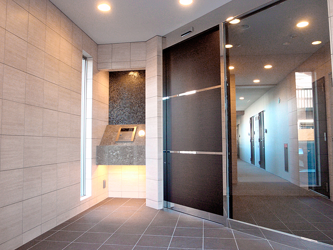 光る鏡面のドアをがアクセントにもなるエントラス内は、外観とは対象的に、明るい色調のタイルを壁面に使用し、床には、濃いこげ茶のタイルを使って、雰囲気を引き締めています。オートロックの操作台も、間接照明と石をさりげなく使い、高級感をかもしだしています。片引きの自動ドアにも、両開き扉と同じデザインモールとすることで、一体感をだしています。