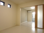 室内は、白を基調として、1階は明るい茶系統の建具等でナチュラルに、2階は濃茶の建具等に所々白の設備をプラスしてモノトーン風にレイアウトしました。部屋の一部にアクセントクロスを使用しデザイン性の高い内装となっています。