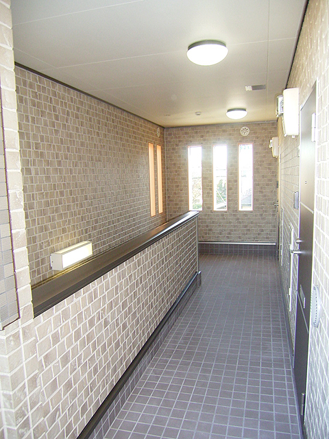 エントランスには、目を引く明るい色合いのボリューム感のあるタイルを採用し、重厚感をだしつつ両側にスリットを入れることで、圧迫感を軽減しました。オートロックの中に入ると、大理石の飾り棚や30cm角の高級感ある床タイルで丁寧に整えられたエントランスホールが、物件全体に上品な印象を与えています。屋根付の駐輪場や、採光と防犯性に配慮した半透明のベランダパネル、システムキッチンや独立洗面台を設けた脱衣室など充実した設備に加え、食器棚もおける余裕をもった間取に収納スペースなど、入居者にとって魅力ある物件となるよう仕上げました。