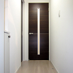 室内は、ベースとなるフローリングや住宅設備を白色とし、建具やカウンターには木調の黒色をアクセントカラーとして配置する事でモダンな雰囲気にしました。白色に対する黒色の割合を調整する事で重くなりすぎず、明るく引き締まった印象を与えてくれます。